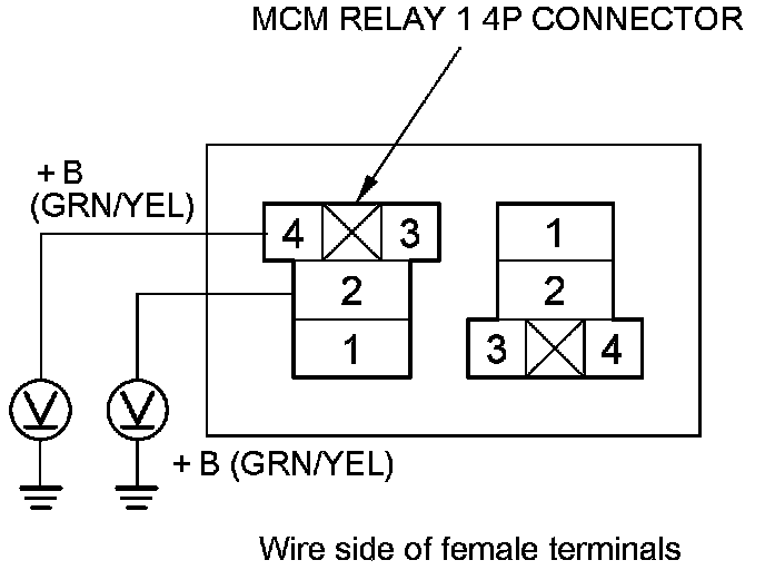 23. Measure the voltage between body ground and MCM relay 1 4P connector terminals No. 2 and No. 4 individually.
