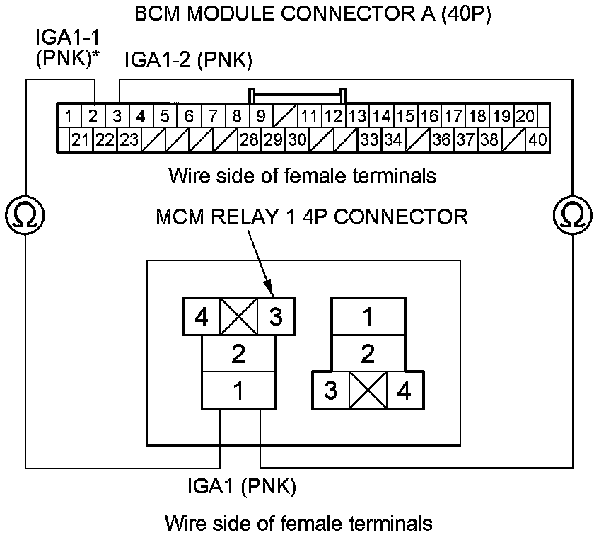 29. Check for continuity between BCM module connector terminal A2* and A3 and MCM relay 1 4P connector terminal No. 1.