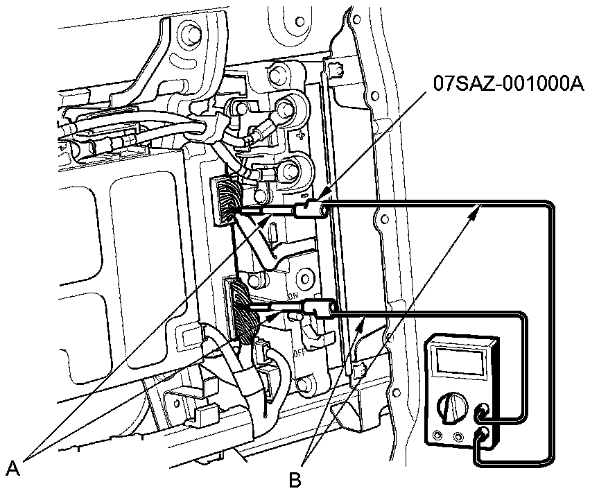3. Remove the BCM module Service and Repair, then connect the backprobe adapters (A) to the stacking patch cords (B), and connect the cords to a digital multimeter.
