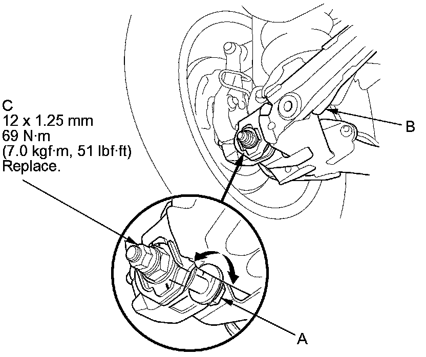 3. Hold the adjusting bolt (A) on the trailing arm (B), and loosen the self-locking nut (C).