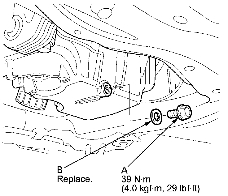 4. Reinstall the drain bolt with a new washer (B).