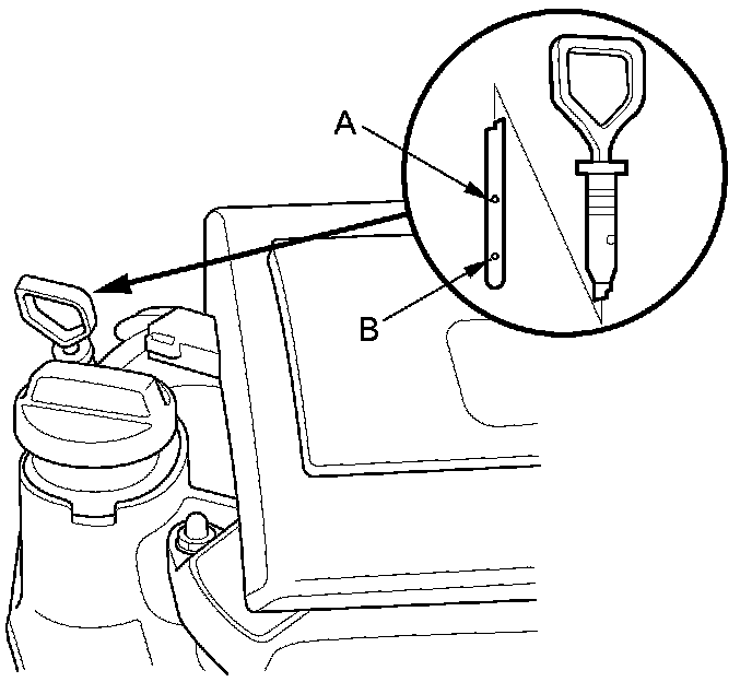 3. Remove the dipstick, and check the engine oil level. It should be between the upper mark (A) and lower mark (B).