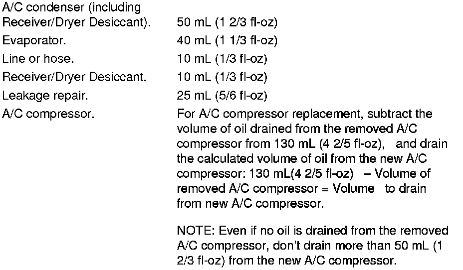 Add the recommended refrigerant oil to the suction port of the A/C compressor in the amount listed if you replace any of the following parts.