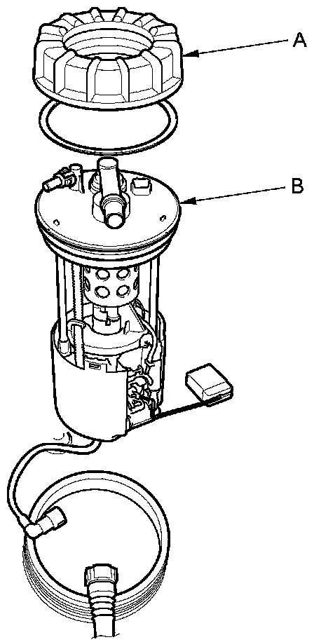 4. Remove the locknut (A) and the fuel tank unit (B).