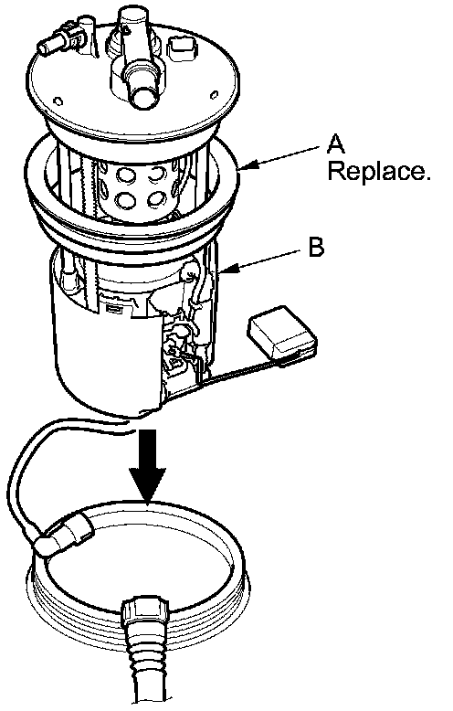 1. Temporarily attach a new base gasket (A) to the fuel tank unit (B), then insert the fuel tank unit partially into the fuel tank.
