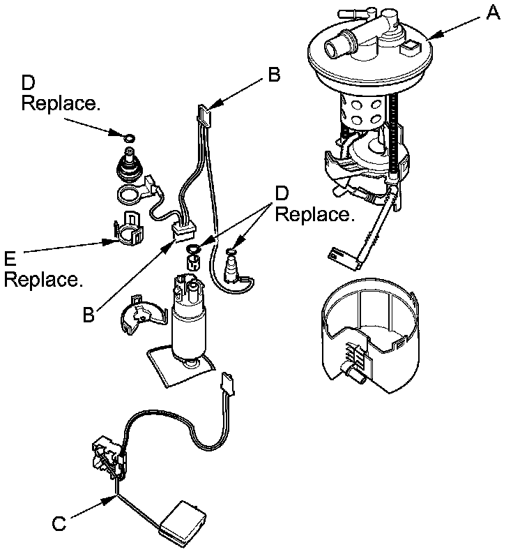 4. Install the parts in the reverse order of removal with new O-rings (D) and a new bracket (E). When installing the fuel tank unit, align the marks on the unit and the fuel tank Fuel Tank Unit Removal/Installation.