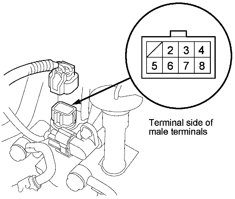 5. Connect a jumper wire from the battery positive terminal to solenoid harness connector terminal No. 4, and connect another jumper wire from the battery negative terminal to terminal No. 8. A clicking sound should be heard.