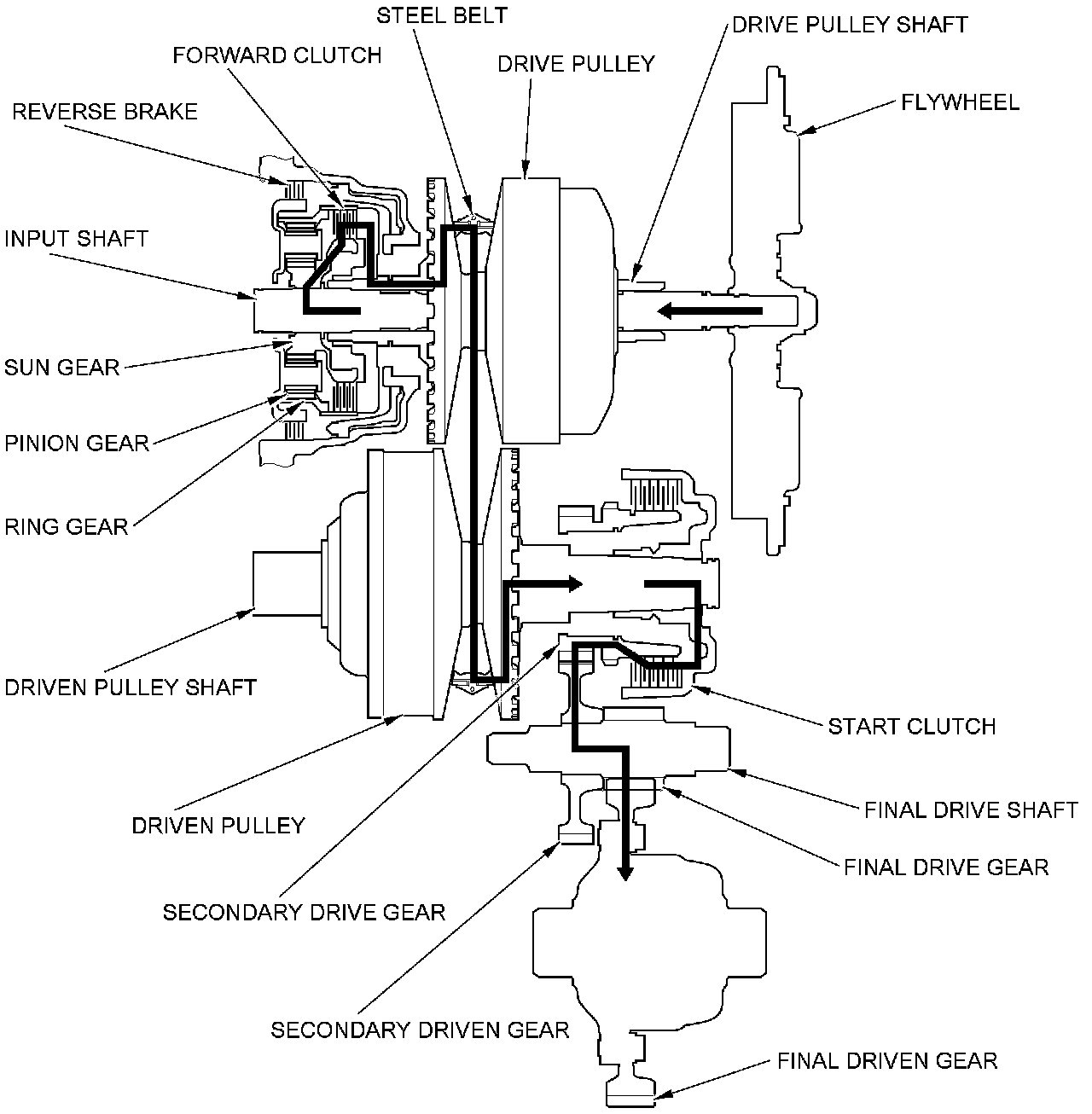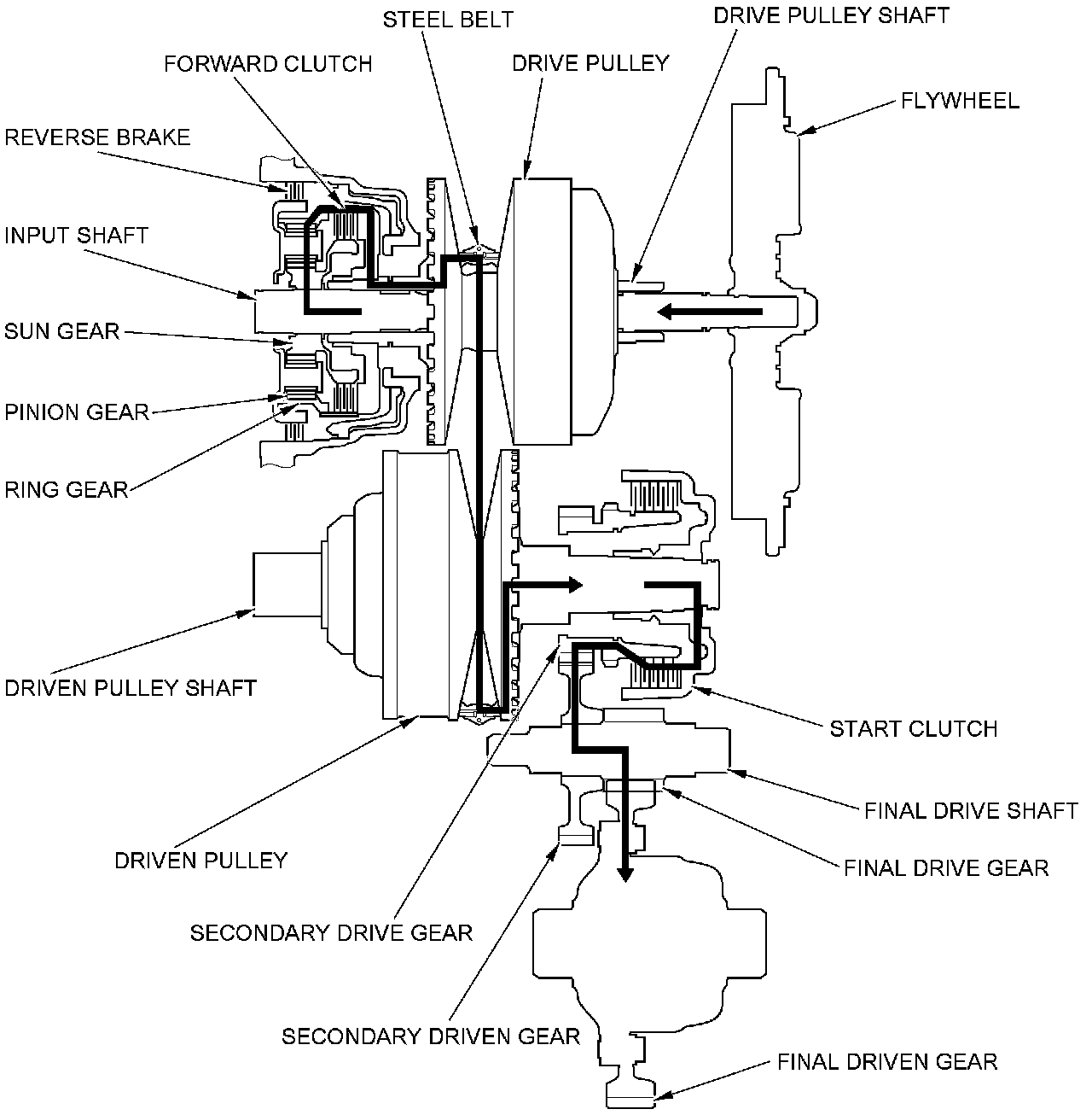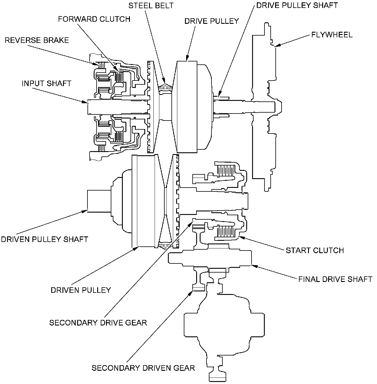 - The driven pulley shaft drives the secondary drive gear via the start clutch.