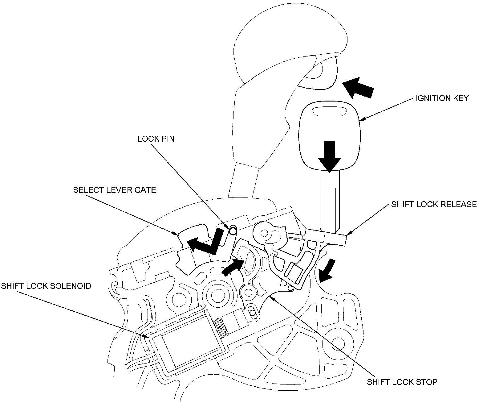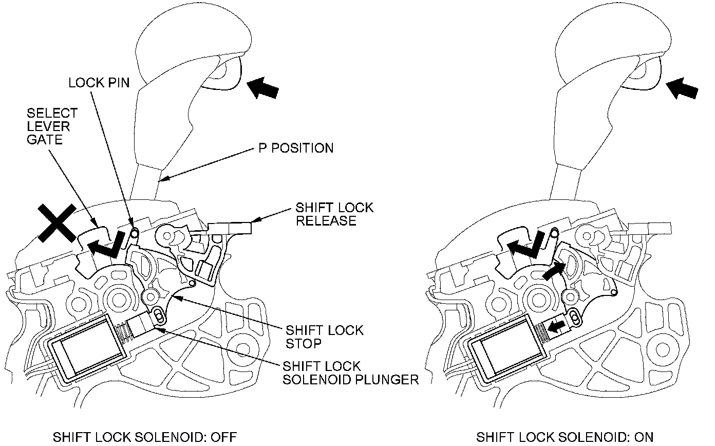The shift lock system prevents the shift lever from mis-shifting. The shift lock solenoid is normally OFF. After starting the engine in P, the shift lever cannot move to any other position from P because the shift lock stop stops the lock pin unless certain conditions are met. When the brake pedal is pressed and the accelerator pedal is not pressed, the PCM commands the shift lock solenoid ON; the shift lock solenoid plunger in the shift lock solenoid pulls the shift lock stop to release the lock pin. Pressing the shift lever button allows the shift lever to move to any other position. When the brake pedal and the accelerator pedal are pressed at the same time, the PCM commands the shift lock solenoid OFF and the shift lock system is locked.