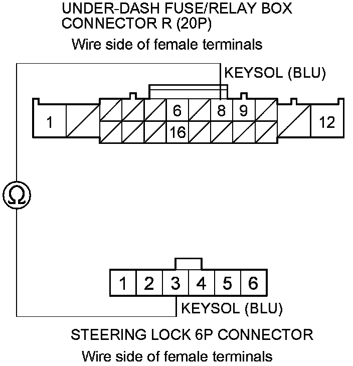 12. Check for continuity between under-dash fuse/relay box connector R (20P) terminal No. 8 and steering lock 6P connector terminal No. 3.