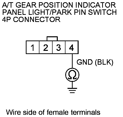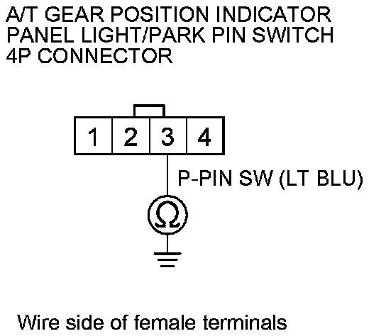 17. Check for continuity between A/T gear position indicator panel light/park pin switch 4P connector terminal No. 3 and body ground.