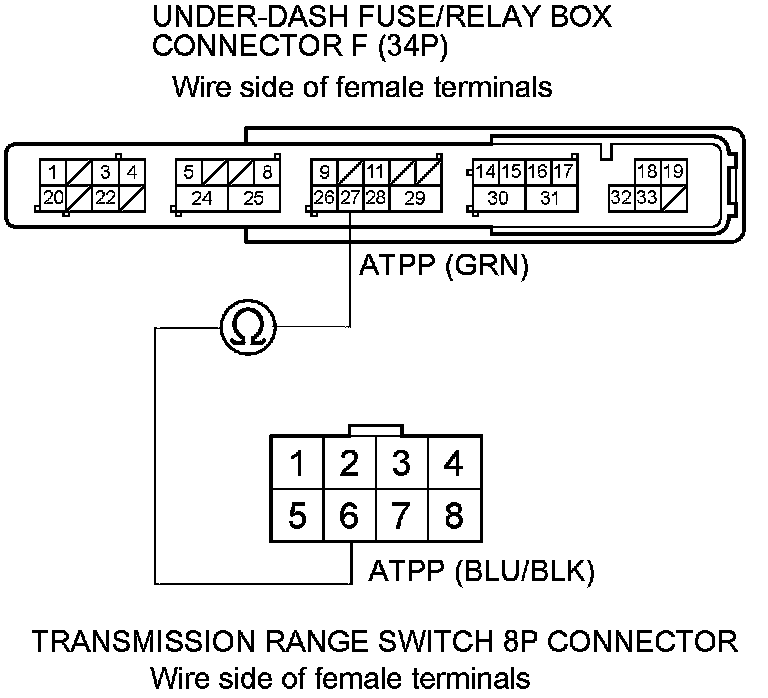 22. Check for continuity between under-dash fuse/relay box connector F (34P) terminal No. 27 and transmission range switch 8P connector terminal No. 6.