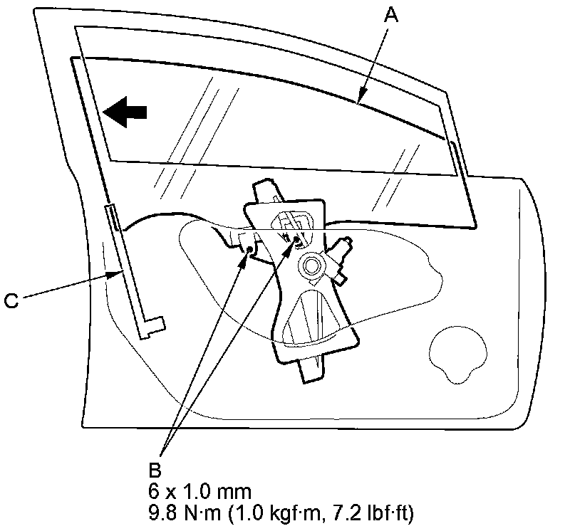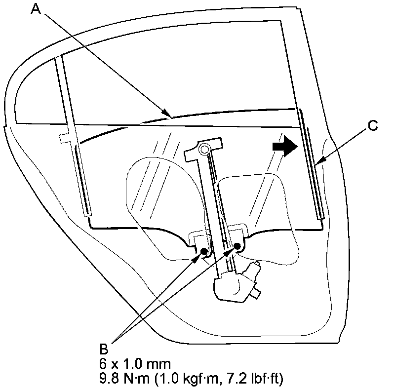 4. Push the glass against the glass run channel (C), then tighten the glass mounting bolts.