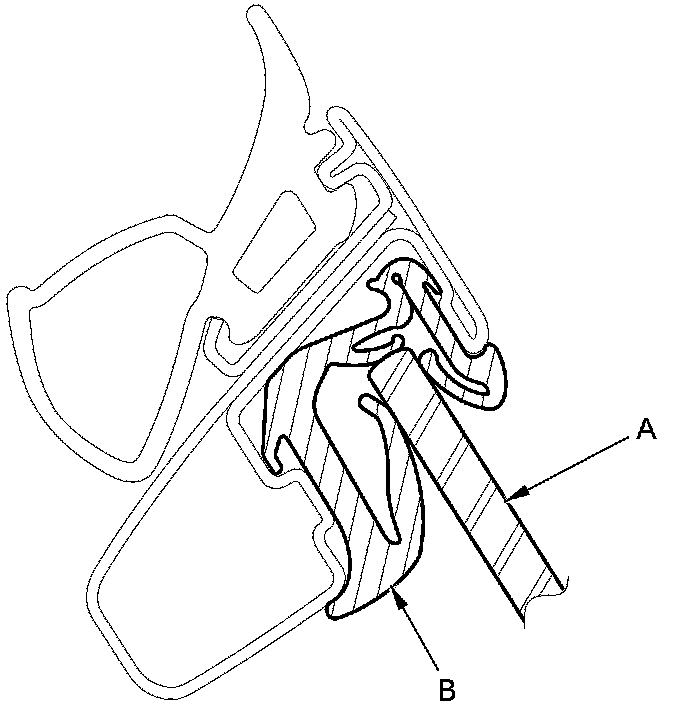 6. Raise the glass fully, and check for gaps. Also make sure that the glass (A) contacts the glass run channel (B) evenly.