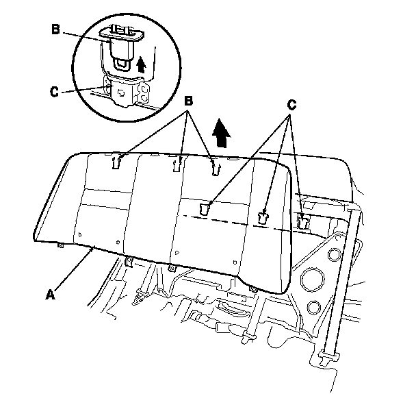 6. Lift up the seat-back (A) to release the wire loops with the collars (B) from the brackets (C) on the body, then remove the seat-back.