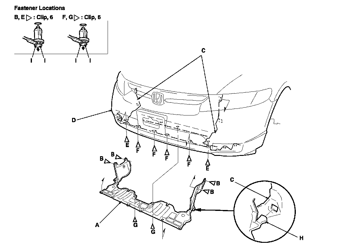 From under the front bumper (D), detach the clips (E, F).