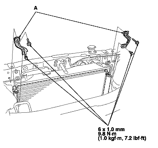 5. Remove the bolts and the A/C condenser upper mount brackets (A).