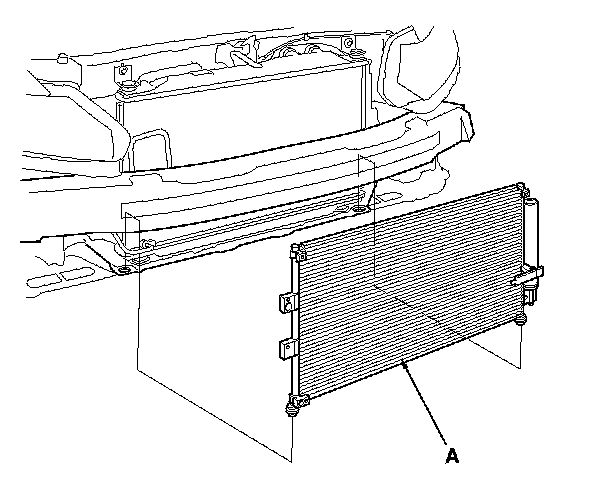 7. Remove the A/C condenser (A). Be careful not to damage the radiator and A/C condenser fins when removing the A/C condenser.