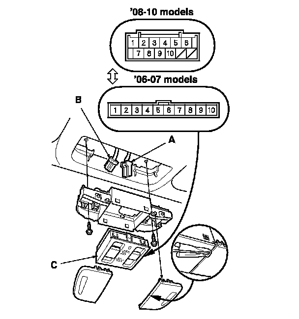 2. Disconnect the moonroof switch 10P [12P] connector (A) and map light 3P connector (B).