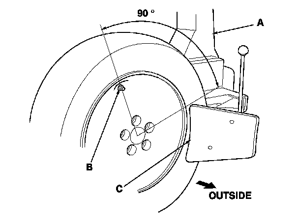 - Position the wheel as shown so the valve stem (B) is 90 degrees from the bead breaker (C) as shown.