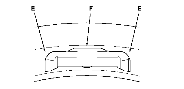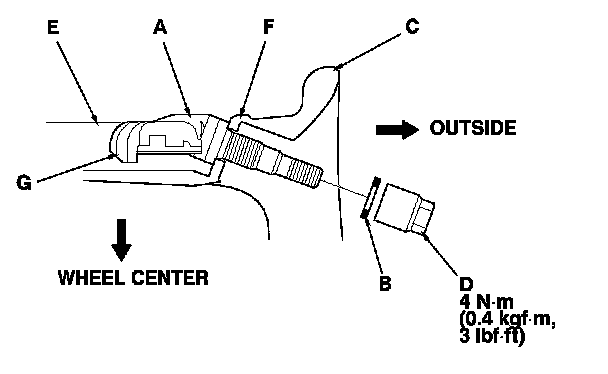 NOTE: Install the tire pressure sensor so that the sensor housing surface (E) should not exceed the protrusion (F) of the wheel to prevent the sensor housing from being caught on the bead of the tire when assembling the tire. Be sure to always mount the tire pressure sensor with the feet (G) in the downward position toward the wheel.