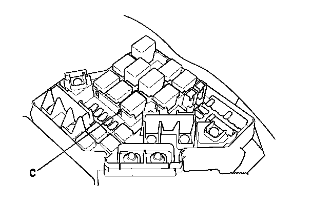 38. Remove PGM-FI main relay 1 (C) from the under-hood fuse/relay box.