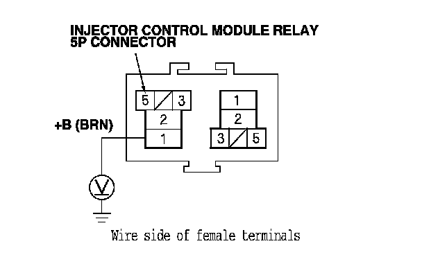 15. Measure the voltage between injector control module relay 5P connector terminal No. 2 and body ground.