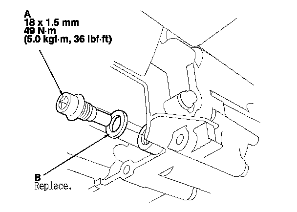 4. Reinstall the drain plug with a new sealing washer (B).