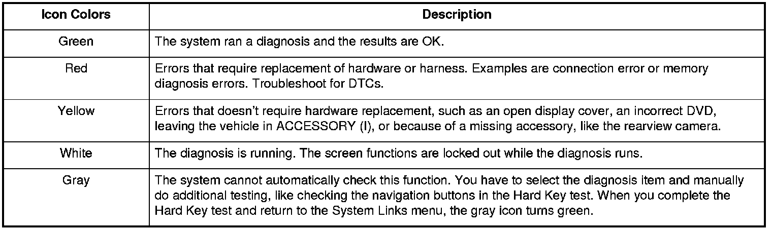 When the diagnosis finishes, the icons turn different colors based on their test status. The color definitions are shown below and can also be seen by selecting Help on the System Links screen.