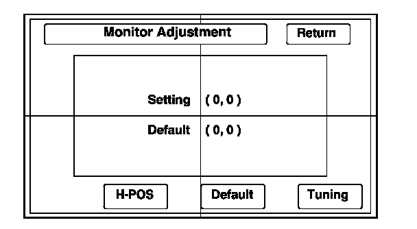 This allows you to center the navigation display. Use the joystick to move the picture up/down or left/right. It is unlikely that you will ever need to adjust the monitor position. The Default button resets the display position to factory specifications. The factory default is (0, 0). The H-POS button is for factory use only.