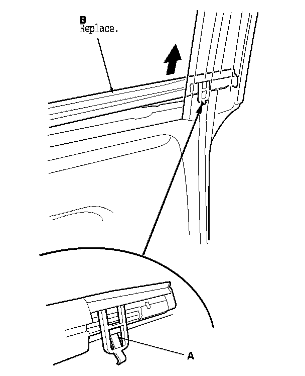 4. Release the rear hook (A) with a flat-tip screwdriver from inside of the door, then remove the rear door glass outer weatherstrip (B).