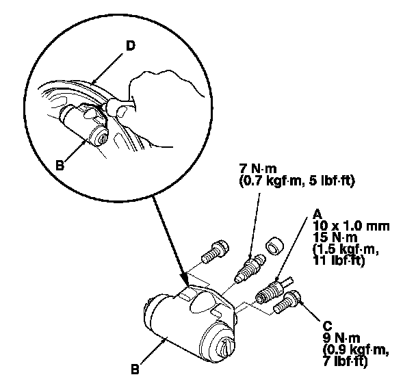 4. Apply Cemedine 366E sealant or equivalent between the wheel cylinder and backing plate (D), and install the wheel cylinder, then connect the brake line.