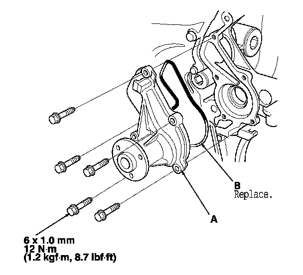 5. Install the water pump with a new O-ring (B).