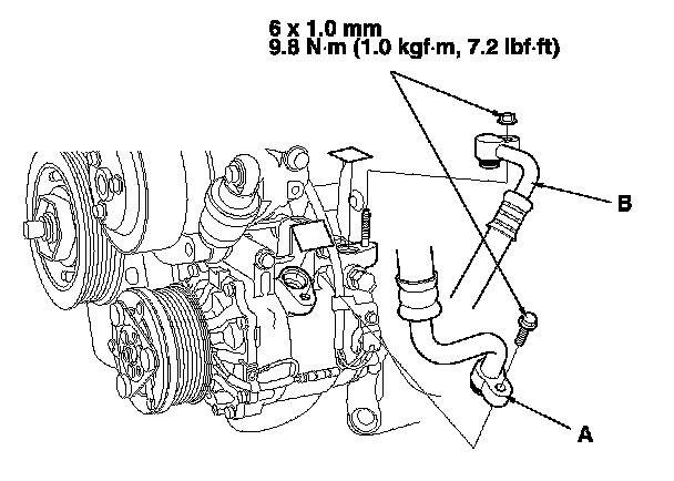5. Remove the bolt and the nut, then disconnect the suction hose (A) and the discharge hose (B) from the A/C compressor. Plug or cap the lines immediately after disconnecting them to avoid moisture and dust contamination.