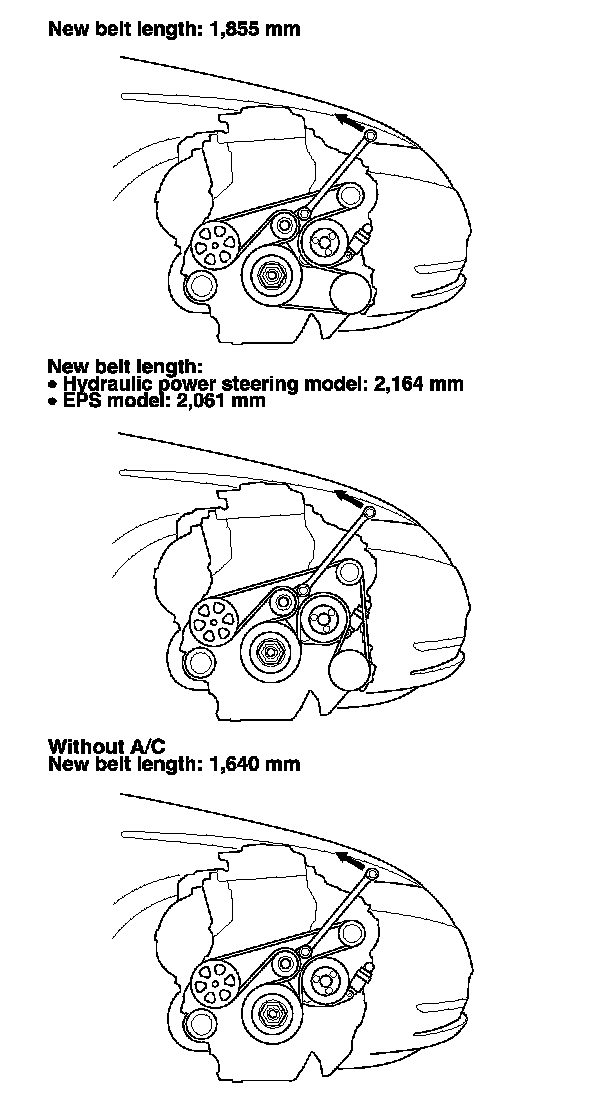 1. Set a long-handled, boxed-end wrench on the drive belt auto-tensioner from above the engine. Slowly turn the wrench in the direction shown, then remove the drive belt.