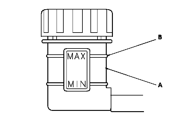 1. Make sure the brake fluid level in the clutch reservoir (A) is at the MAX (upper) level line (B).