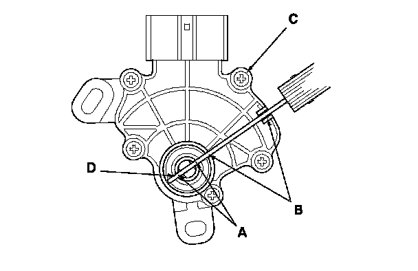 6. Align the cutouts (A) on the rotary-frame with the neutral positioning cutouts (B) on the transmission range switch (C), then put a 2.0 mm (0.08 in) feeler gauge blade (D) in the cutouts to hold the switch in the N position.
