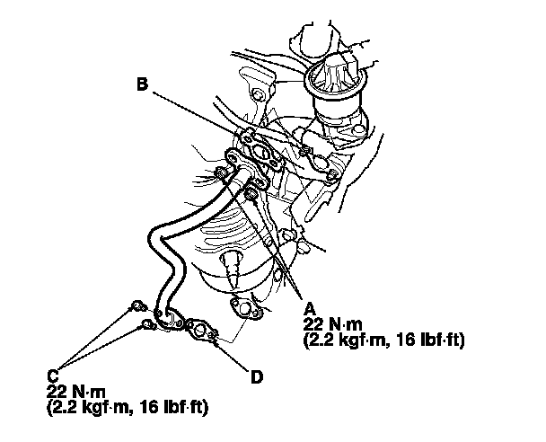 2. Install the EGR pipe on the TWC side, and tighten the bolts (C) with a new gasket (D).