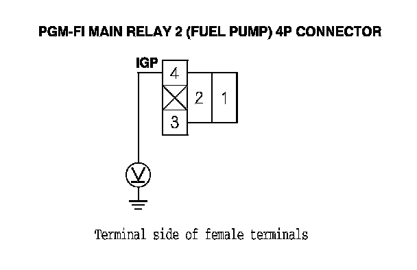 5. Measure the voltage between PGM-FI main relay 2 (FUEL PUMP) 4P connector terminal No. 4 and body ground.