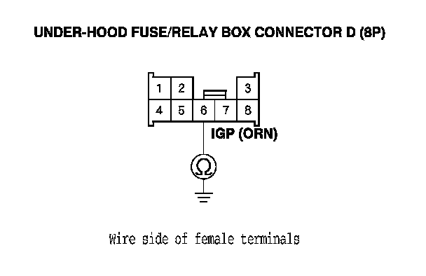 11. Check for continuity between under-hood fuse/relay box connector D (8P) terminal No. 6 and body ground.