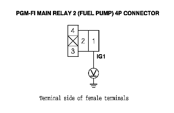 12. Measure the voltage between PGM-FI main relay 2 (FUEL PUMP) 4P connector terminal No. 1 and body ground.
