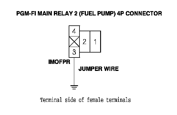14. Connect PGM-FI main relay 2 (FUEL PUMP) 4P connector terminal No. 3 to body ground with a jumper wire.
