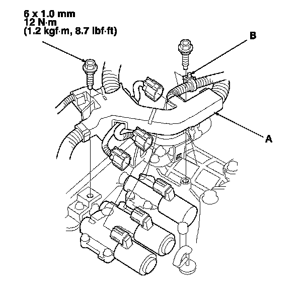 6. Remove the mounting bolts securing the harness cover (A), and remove the harness clamp (B).