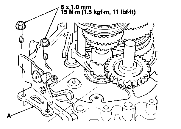 12. Make sure the 69 mm snap ring (A) is securely seated in the groove of the countershaft bearing.