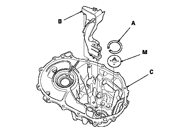 6. Select the proper size 52 x 62 mm shim (A) according to the measurements made during the Mainshaft Thrust Clearance Adjustment. M/T Mainshaft Thrust Clearance Adjustment Install the oil gutter plate (B), oil guide plate M, and the 52 x 62 mm shim into the transmission housing (C).