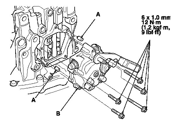18. Install the 8 x 10 mm dowel pins (A) and the change lever assembly (B).