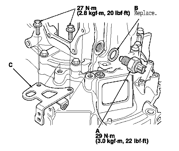 22. Install the back-up light switch (A) with new 18 mm washer (B), and the transmission hanger (C).