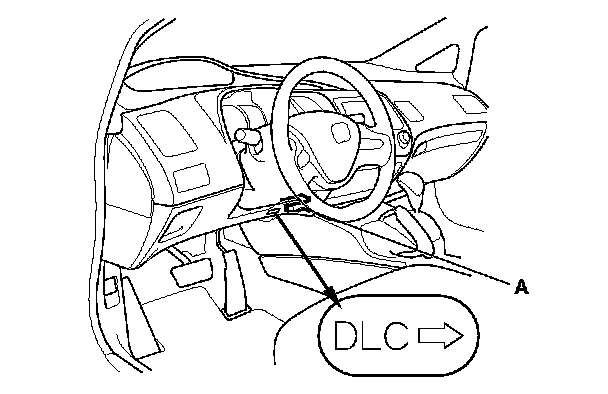 When the D indicator has been reported on, connect the HDS to the DLC (A) located under the driver's side of the dashboard. Turn the ignition switch to ON (II), select SCS mode, then the D indicator will indicate (blink) the DTC.