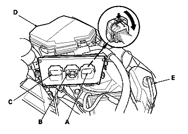 4. Remove the coolant reservoir (E). Disconnect PCM connectors A, B, and C.