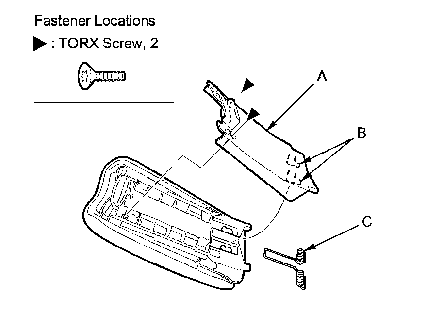 2. Remove the TORX screws with a TORX T15 bit. Slide the armrest liner (A) downward to release the hooks (B), then remove the armrest liner and the armrest spring (C).